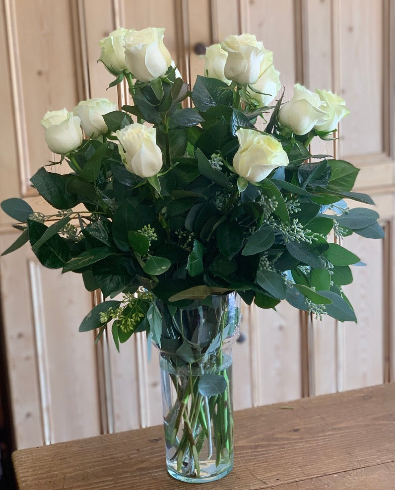 Creamy and dreamy white roses arranged with our best greens in a premium clear glass vase with a French bow.