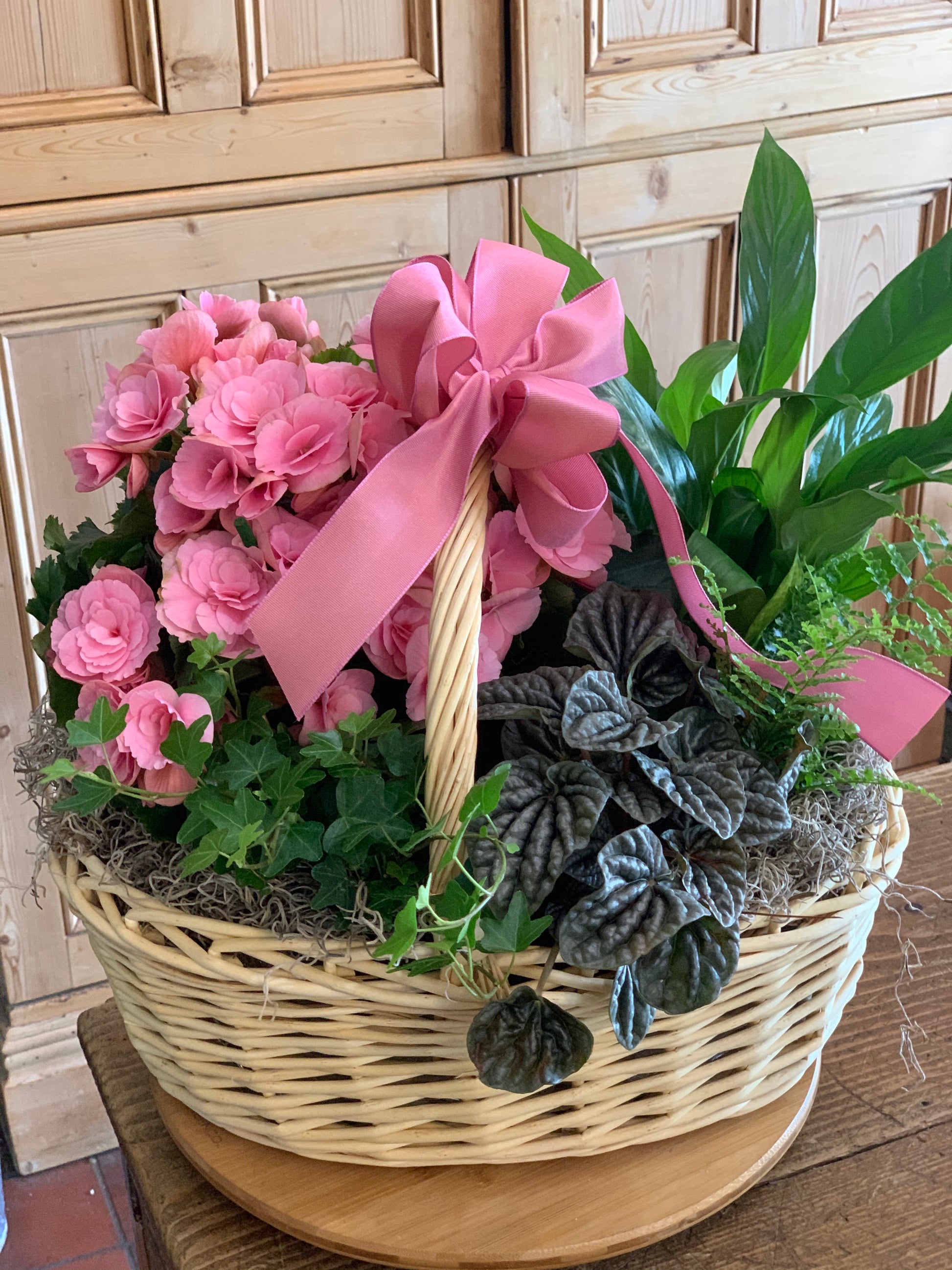 A garden in a basket, our designers will pick out a lovely mix of green and blooming plants to fill a handled basket to send for you. If you would like us to use or omit a color please let us know.