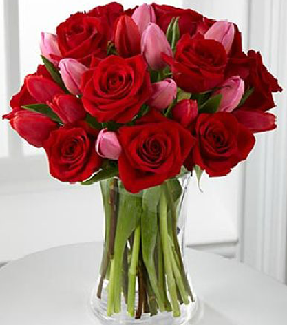 Red roses and tulips accented pink and red tulips arranged in a clear glass vase. The bouquet pictured reflects our original design for this product. While we always try to follow the color palette, we may replace stems to deliver the freshest bouquet possible, and we may sometimes need to use a different vase.