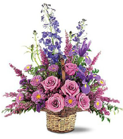 This somber mixture includes a variety of field flowers to go along with the purple casket spray. Flowers that may be included are: Purple roses, delphinium, iris, with filler and greens