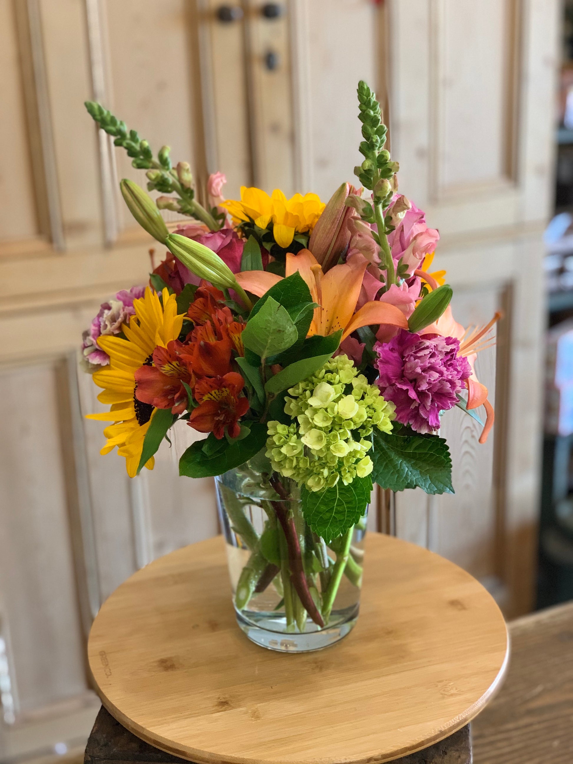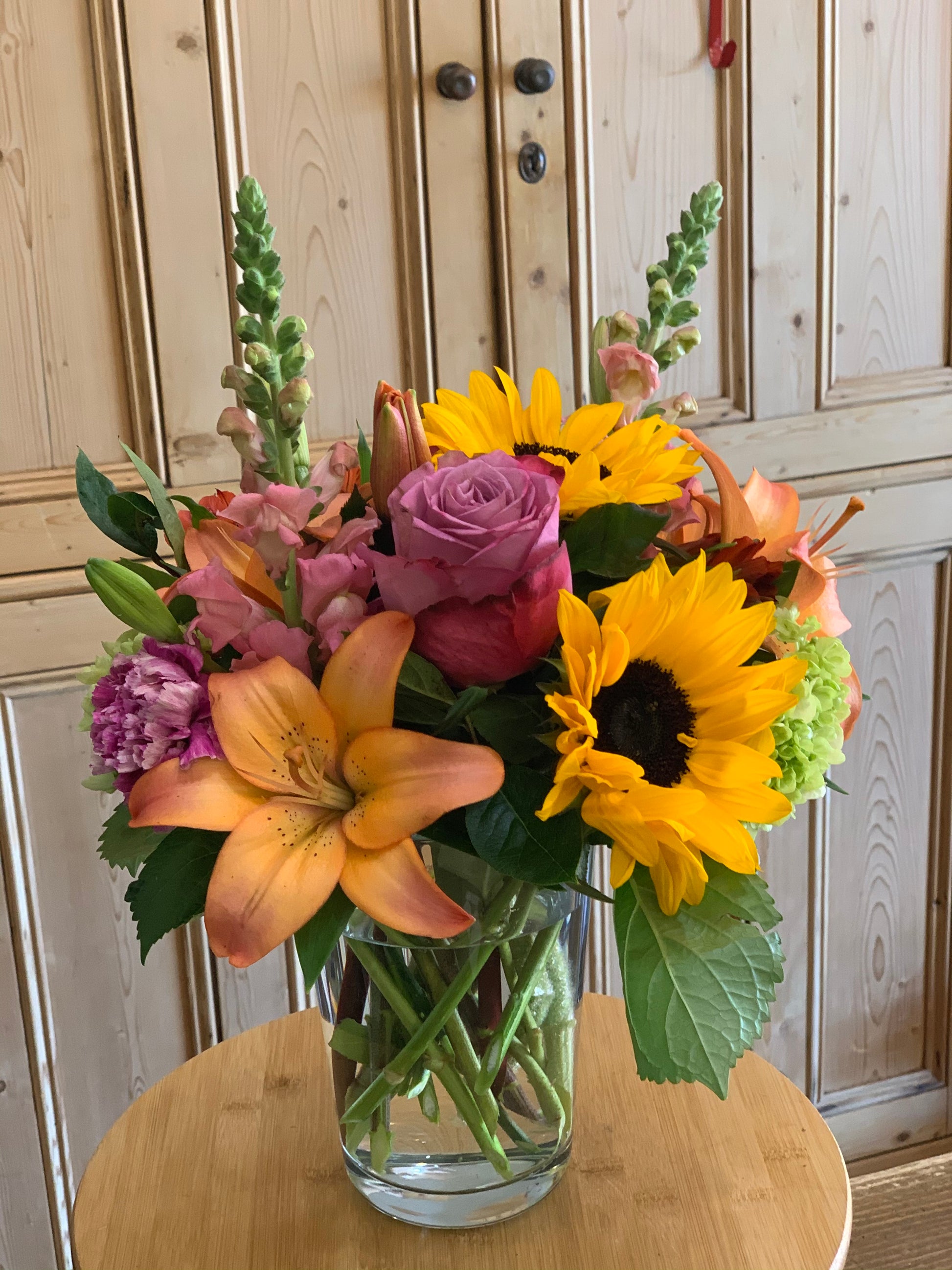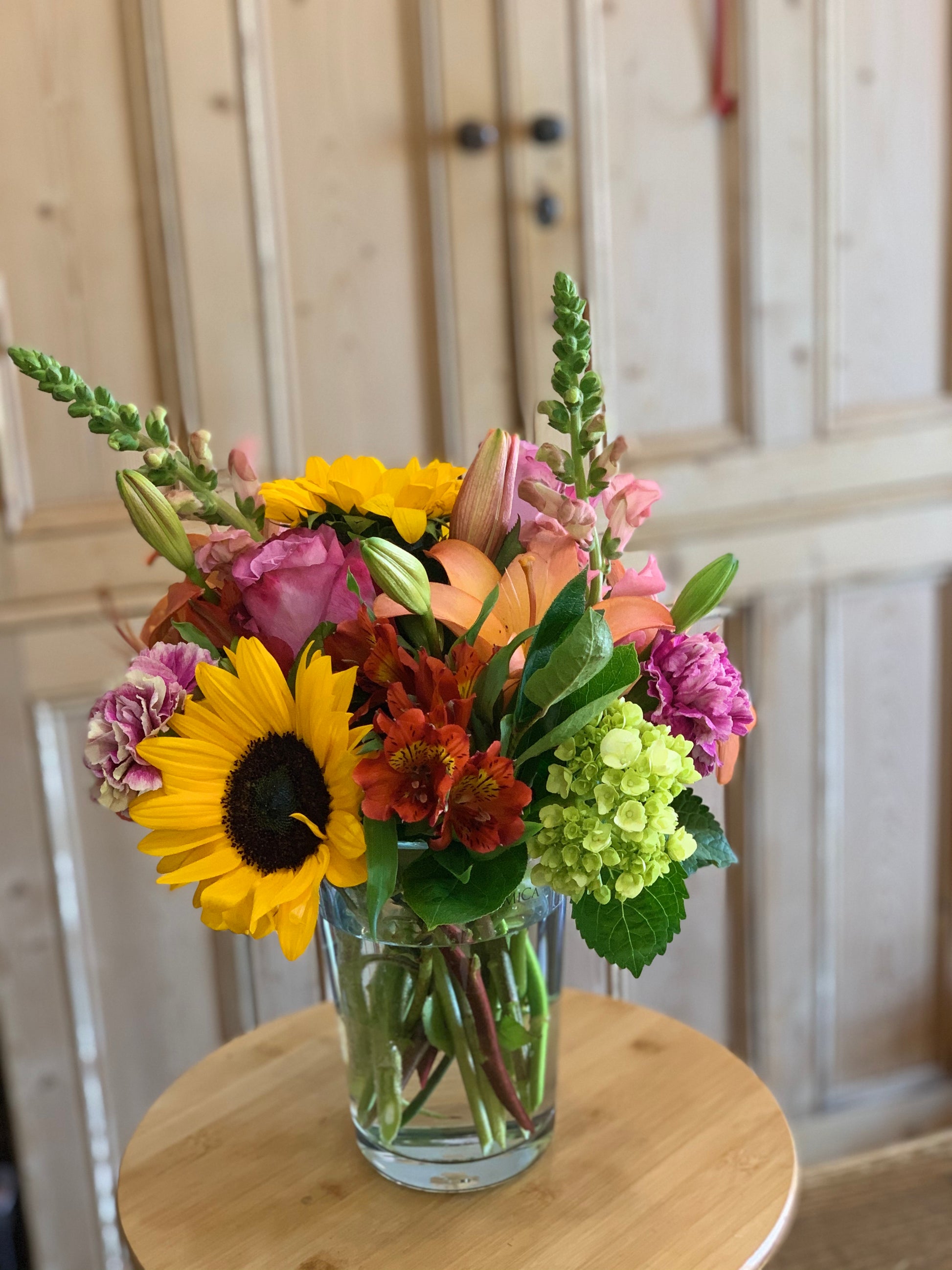 This low and lush stunner will brighten up anyone’s day. Filled with colorful blooms sure to bring a smile to your loved ones' faces. This includes, roses, alstroemerias, carnations, sunflowers, snapdragons, and mini green hydrangea arranged all around.