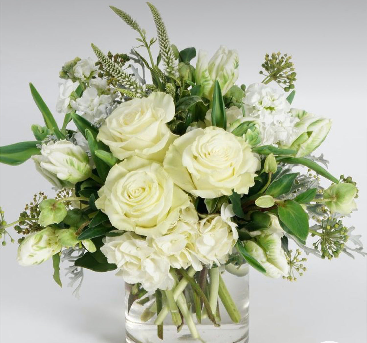Wild and organic this green and white floral arrangement brings lots of texture to the game. Arranged all around filled with white hydrangeas, creamy white roses, premium white tulips, veronica, hellebores, and greens.