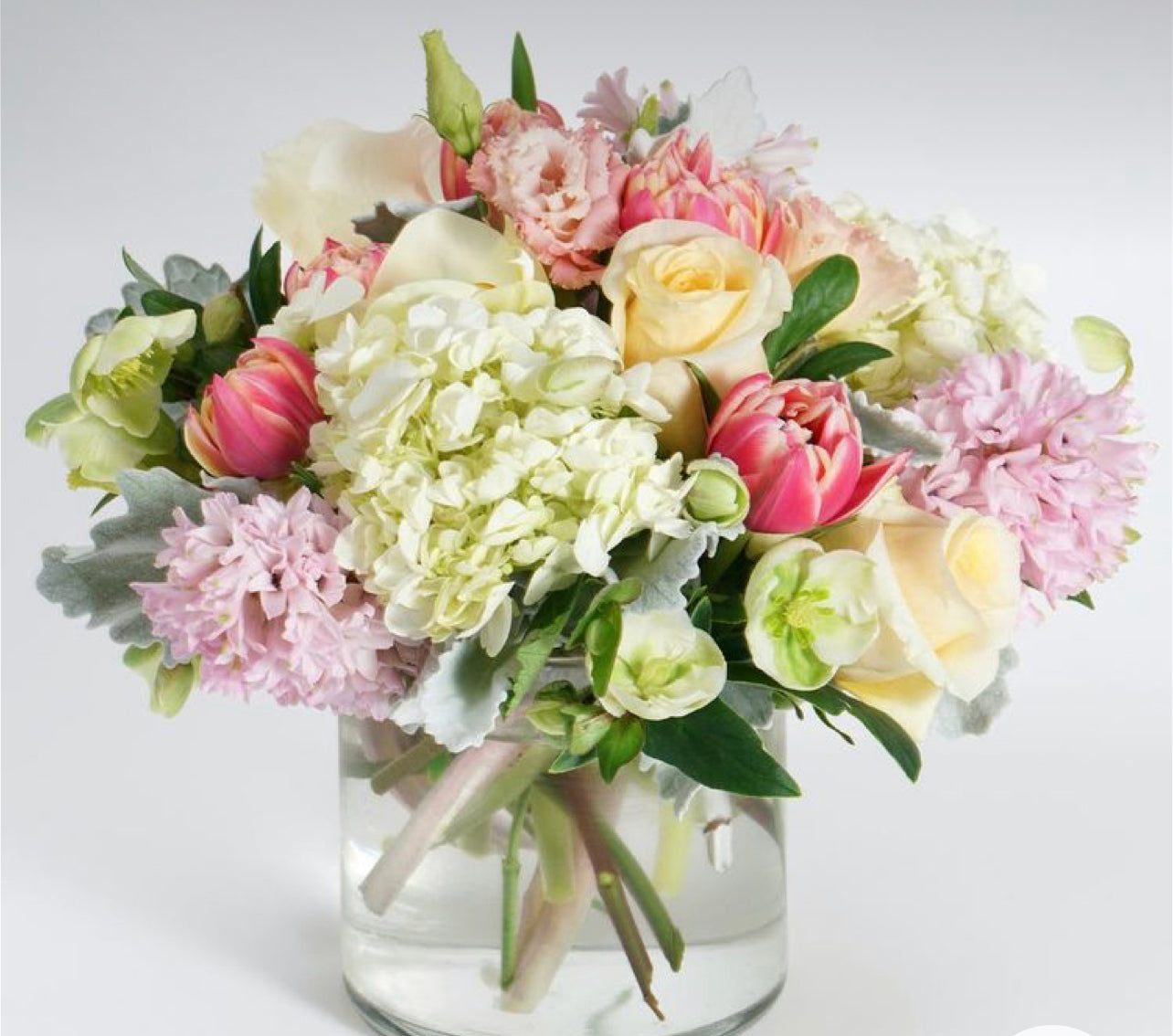 Starting off the new year with this low and lush stunner. Bright pastel arranged all around in a clear glass vase. This arrangement includes: mini green hydrangeas, double tulips, lisanthus, hyacinths, pale yellow roses, hellebores, greened with soft dusty miller.