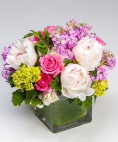 A true english garden delight arranged with beautiful blush peonies, pink roses and local grown stock, mini green hydrangea, with garden based greens. Bring some garden to the inside with this lovely.