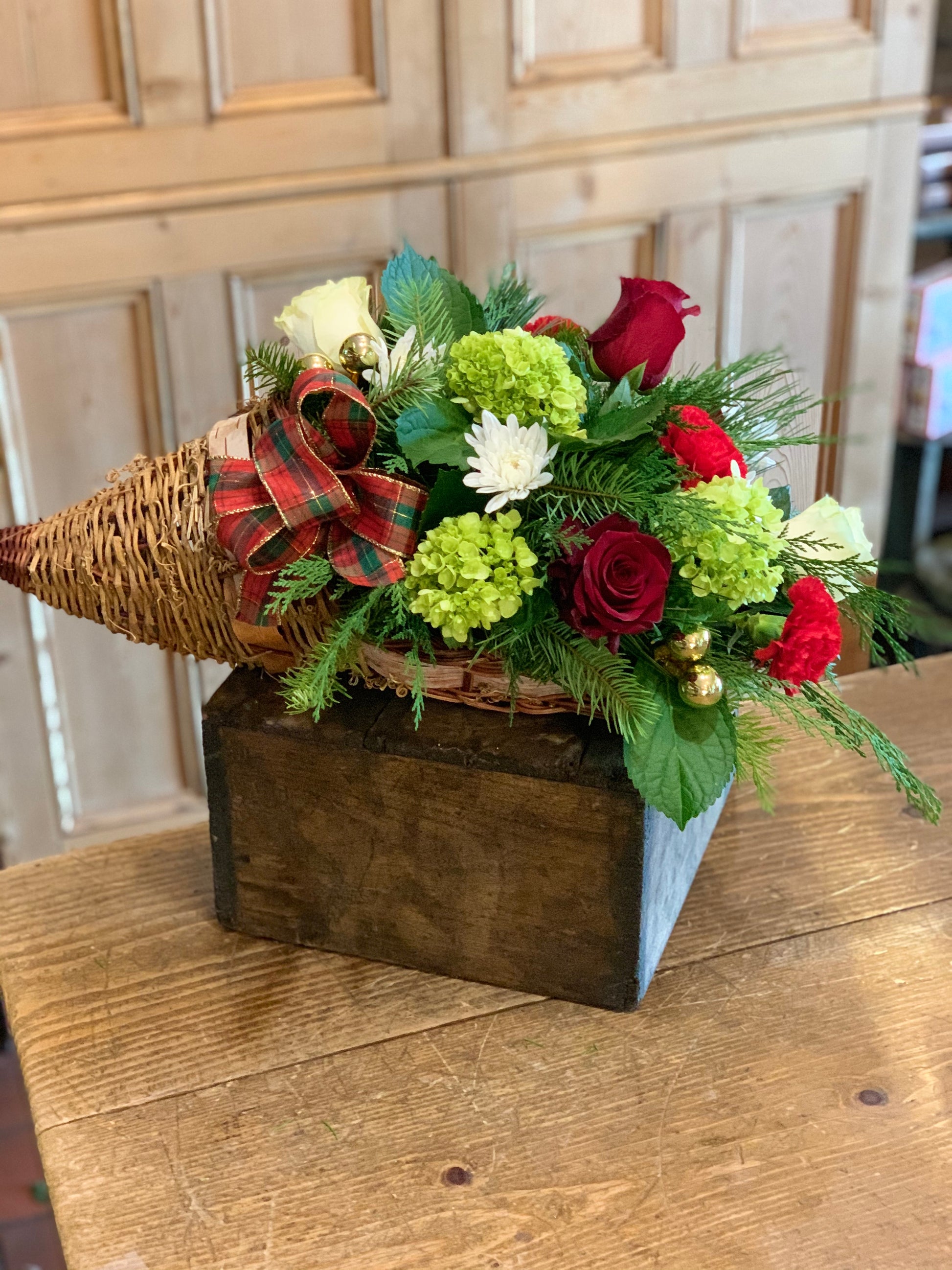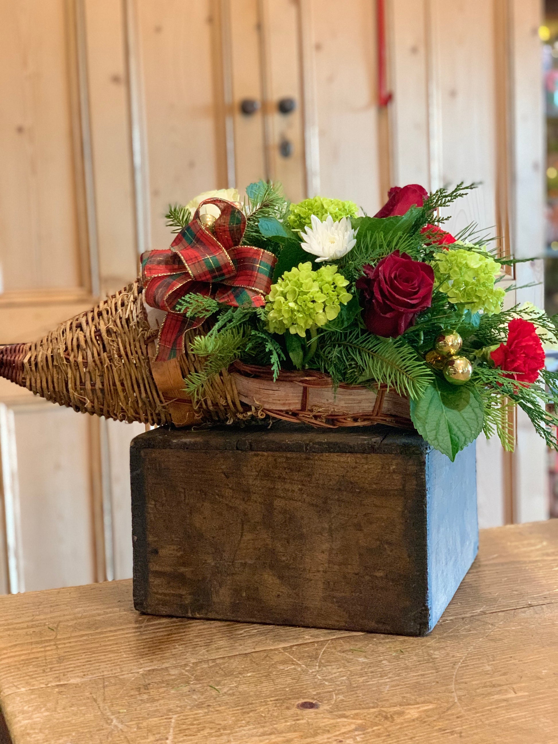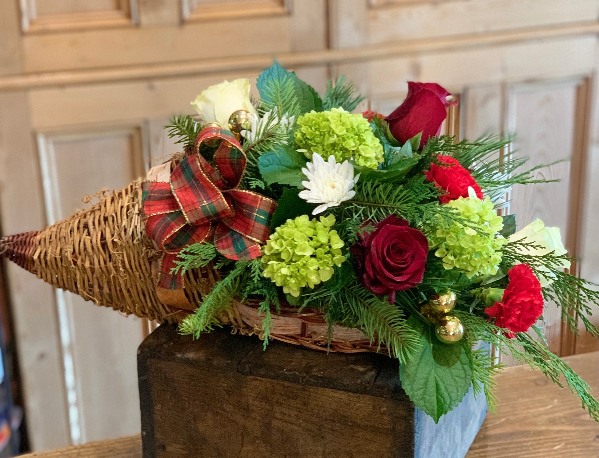 No squirrels will come out of this festive arrangement. Celebrating this season with this festive cornucopia filled with white and red roses, mini green hydrangea, carnations, pom-pom mums, and festive winter greens, completed with a ribbon, pinecones, and Christmas ornaments.
